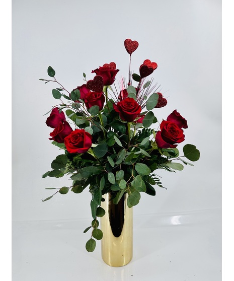 Red imported roses with fragrant eucalyptus and accented with explosion of romantic hearts in a gorgeous gold cylinder.