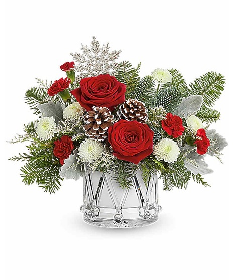 Little Drummer Joy Bouquet features red roses, red miniature carnations, white button spray chrysanthemums, white limonium, cedar, dusty miller, and noble fir-arranged in a keepsake crystal drum vase.