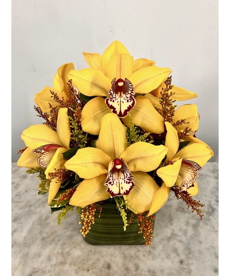 Long-lasting Cymbidium orchids imported from Holland are arranged in a glass cube with decorative accent flowers and greens. Cymbidium comes from "Cymba," the Latin Word for boat- which refers to the flower's lip. They are commonly known as boat orchids.