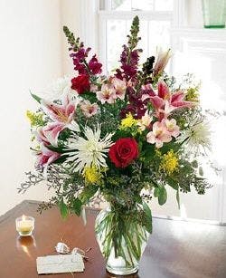 Express your caring wishes with our gracious bouquet. We can have a magnificent design created from fresh floral favorites such as roses, 'Stargazer' lilies, snapdragons, Fuji mums, alstroemeria, and fresh greens and present them in a classic glass vase.