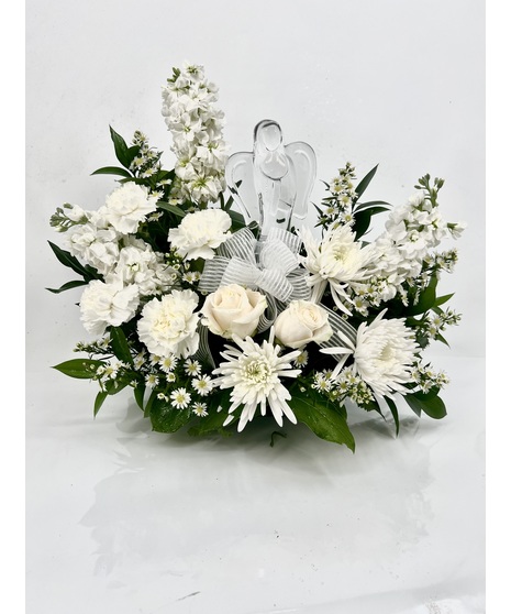 Peaceful and majestic, a graceful angel rests amongst fragrant, snow white roses, mums and stock - a touching tribute to a bright life and your unending support.