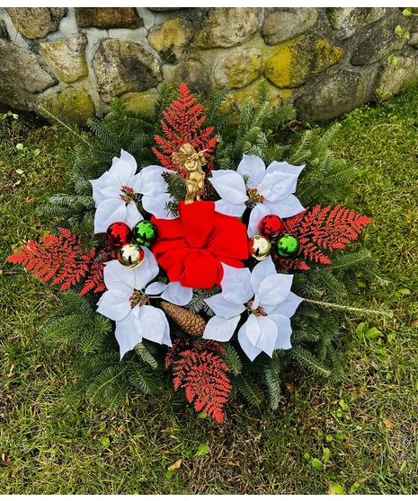 Evergreen pillow on a stand with extra decorations for the graveside.